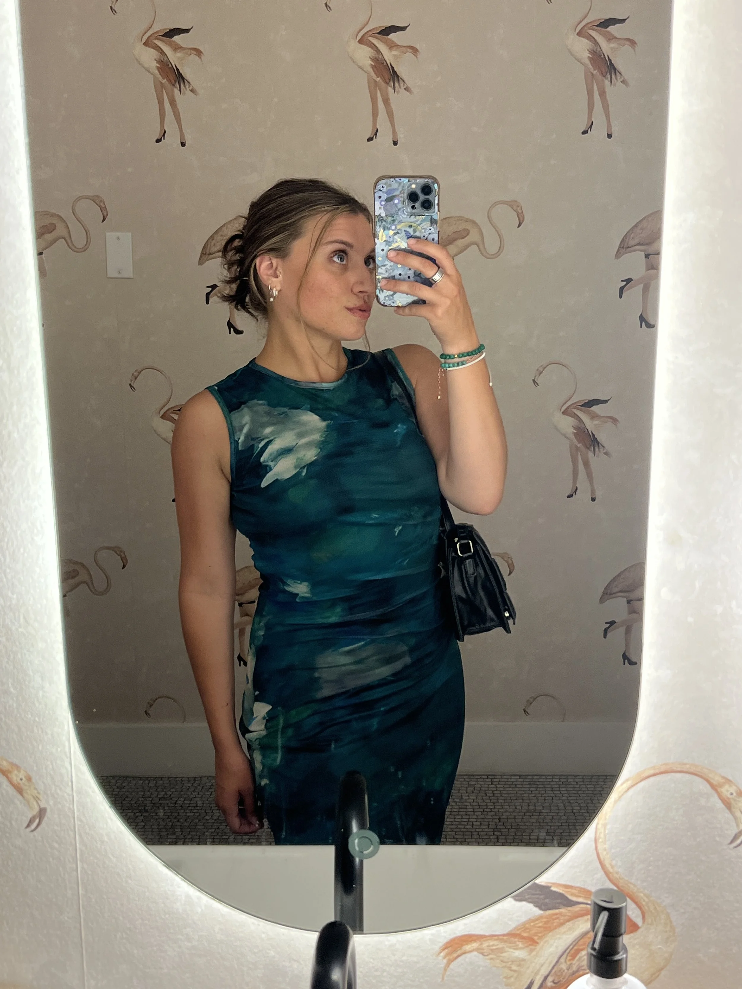 Mesmerized by emerald sleeves draped around a crystallized silhouette.